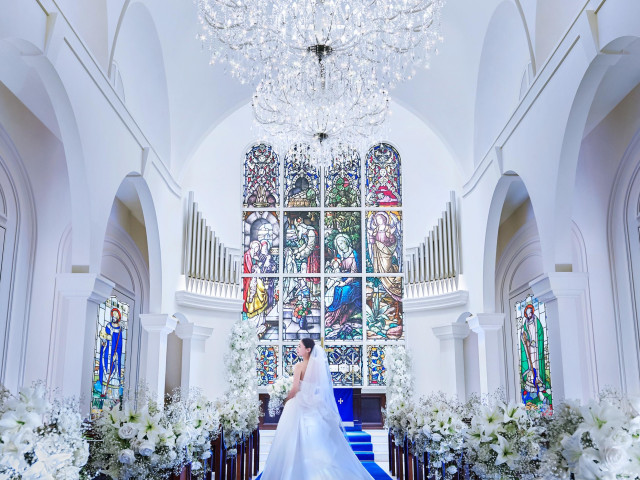【「青」が印象的で美しい教会での入場体験】純白のウェディングドレスが、綺麗に映えるロイヤルブルーのバージンロードは、花嫁とゲストからも評判を頂いております。人前式や善光寺式も承り可。