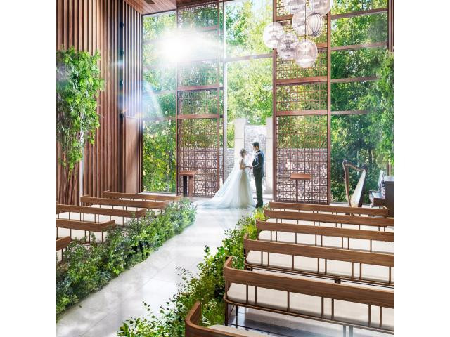 【木のぬくもりと緑に溢れた挙式】正面の大きな窓から光が降り注ぐ開放感溢れるチャペルで入場体験。ハープやバイオリンの生演奏とゲスト全員に見守ってもらえるシアター形式の造りが感動的なセレモニーを演出します