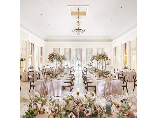 【本番同様のコーディネートを大公開★年間1万組以上の結婚式を手掛ける大手T&Gグループ】貸切の邸宅はレイアウトや装飾、クロスの色もすべてが自由。トレンドを押さえながらふたりに合わせたコーデをご提案♪