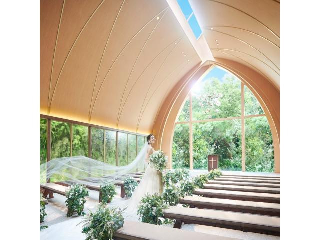 【選べる2つのチャペル】<陽光差し込む光と森の大聖堂><水音広がる光と水の純白チャペル>自然光のスポットライト降り注ぐ、ぬくもりのチャペルで、本番さながらの挙式体験が好評♪初めてのご見学で挙式料特典!