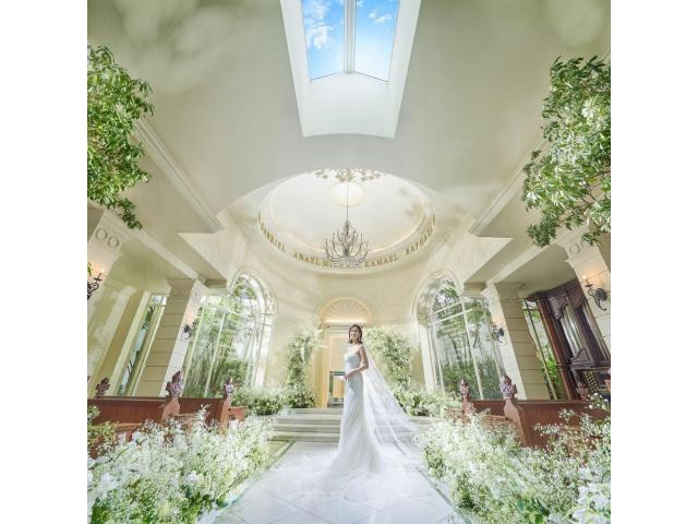 【緑と光のチャペルとガーデンでのアフターセレモニー】花嫁を輝かせる陽光差し込むチャペルでの入場体験ができる!自然光に照らされたバージンロードは必見!広がる青空の下でのセレモニーで当日の感動を体験できる