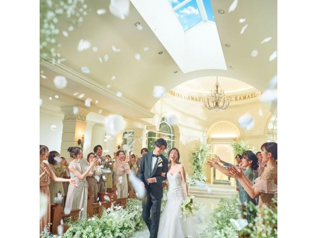 【感動の挙式体験】圧巻の天井高を誇る独立型チャペル。チャペル内は、鮮やかな緑と心地よい陽光が差し込み、おふたりを引き立てます。ブライダルフェアでは、当日さながらの挙式入場体験ができ、イメージ作りにも◎