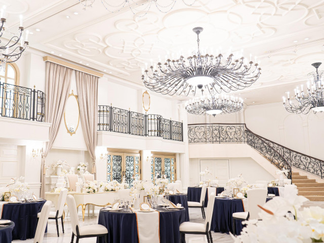 大階段にシャンデリア 華やかさの中に気品溢れる上質空間!白亜の披露宴会場にはプロジェクションマッピングはパーティーを盛り上げます。