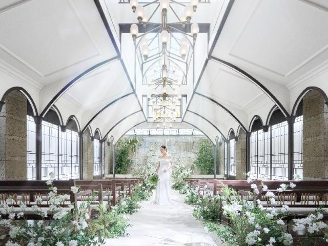 【水と光の感動チャペル体験】天窓の美しいステンドグラスから振り注ぐ柔らかな光が新婦様を包む感動の新チャペル。宗教色がないからこそキリスト教式の他、自由度の高い洋装人前・和装人前式も行っていただけます。