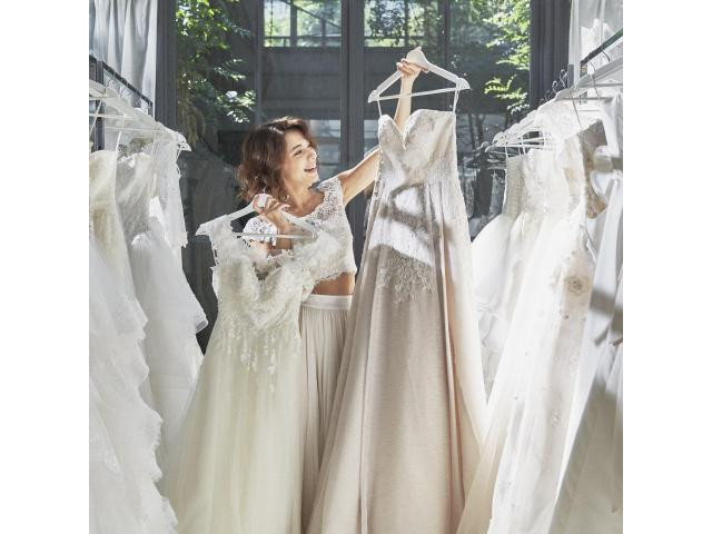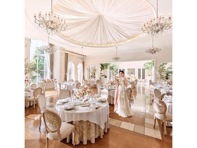 【館内の衣裳サロンを実際に体験】館内ドレスサロン「ACQUA GRAZIE」にご案内。ヨーロッパやNYの厳選されたインポートドレスを始め、有名ブランドも豊富にお取扱い。朝フェア参加の方はドレス試着可能