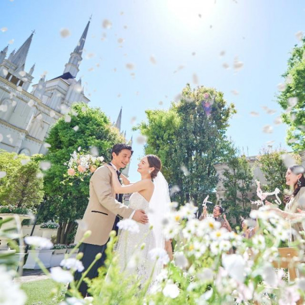 シャトー・プロヴァンス2階のテラスから1階のガーデンにドラマティックに入場したり、噴水のあるプールにウエルカムメッセージを浮かべてバルーンリリースをしたり。季節の花と緑に包まれたガーデンで、開放的なパーティを楽しんで!