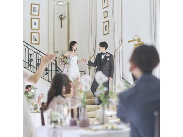 【憧れの結婚式をイメージ】ゲストも羨む憧れの”大階段”の入場体験や先輩カップルの映像上映会などご用意!会場隣接のプール付ガーデンがあるから、開放的な空間でのセレモニーやゲスト参加型演出も楽しめる