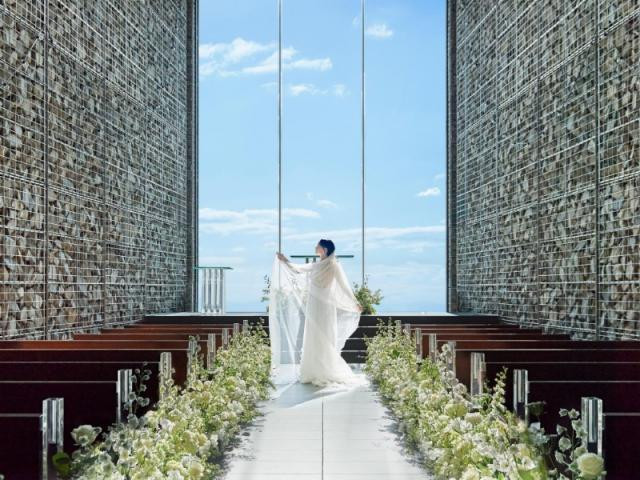 【当日さながらの感動体験】<空に永遠を誓う 神秘的で唯一無二の「天空の教会」>空・海を望み、自然光が入る絶景の特等席。ゲストの心に残る挙式入場体験も要チェック。