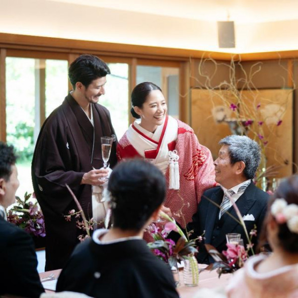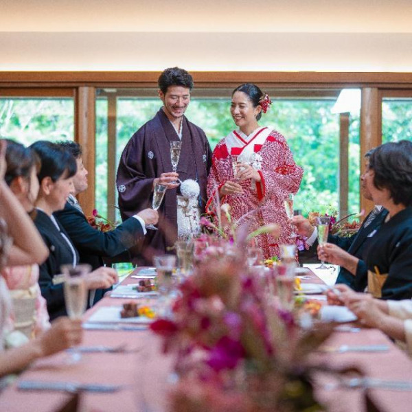 【プラン特典】新郎新婦衣装各1点ずつ・着付けヘアメイク・挙式料・会場使用料・料理&ドリンク×大人人数分・司会者・親族集合写真などを含むお得なパッケージプラン※挙式スタイルや衣装のカスタマイズも可能