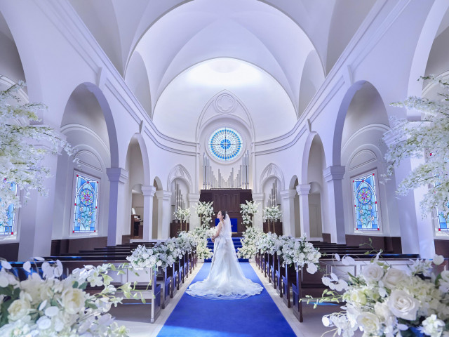 | おすすめ ポイント | 都会に有りながらも天井が高く、長いバージンロードは本格的。「永遠」を意味するブルーのステンドグラスのもとで永遠の誓いをかわして! |