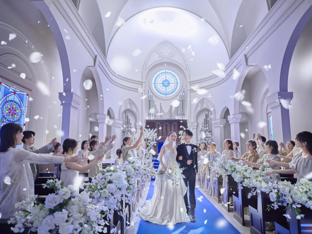 《憧れ花嫁続出★荘厳な都心の大聖堂》永遠を表すロイヤルブルーの世界観に満ちた大聖堂で入場や演出体験も◎\大阪最大級の規模★/ドレスが美しく映える13mのバージンロード&10mもの天井高は圧巻の開放感!