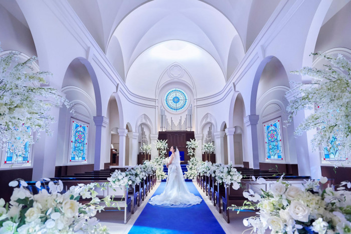 | おすすめ ポイント | 都会に有りながらも天井が高く、長いバージンロードは本格的。「永遠」を意味するブルーのステンドグラスのもとで永遠の誓いをかわして! |