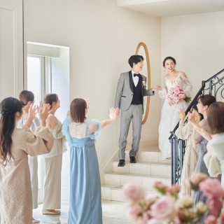 白を基調としたチャペルで、真ん中にはステンドグラスがありとても綺麗です。他にはあまりないブルーのバージンロードで、白のウエディングドレスが凄く映ます。こちらも珍しい演出だと思いますが、新婦入場前にチャペルの内で1分程のオリジナルムービーを流せるのが凄く感動的で素敵です。披露宴会場は2種類あり、それぞれ最大人数と大きさ、雰囲気も少しずつ違いました。私たちが使用した小さい方の会場は、最大60名程入れて、白を基調とした中に少し木の温もりがあるナチュラルな雰囲気でした。大きい方の会場は全体的に白くエレガントが雰囲気で、装飾やドレスの色が映えそうな印象でした。これはどちらの会場も可能な演出で、扉にスポットを当ててシルエットで演出ができるところが魅力的です。ウエディングケーキ、衣装、エンディングムービー、ブーケ代オープニングムービー、生い立ちムービーは自作しました。席次表などのペーパー類、プチギフト、芳名帳は自分達で用意し節約しました。ドレス以外の髪飾り、靴などは持ち込みしました。私たちは仔羊の低温ローストがメインの前菜からデザートまで含め5つのお料理+パン3種、コーヒー、ドリンクのコースを選びました。どの料理も美味しく、見た目も綺麗で、ゲストから好評でした。パン3種の中にクロワッサンが入っているのも珍しく嬉しいポイントでした。最後にカットしたウエディングケーキも皆に配られ、甘すぎず上品な味で美味しかったです。各なんば駅から徒歩で来ることが出来、5〜15分あれば着きます。ほとんど地下を通って行けるので、雨の日や暑い日も比較的アクセスしやすかったです。式場の前には木や緑があり、式場の外もイルミネーションがキラキラしていて綺麗です。関わって下さったスタッフ皆さん良い方ばかりで、打ち合わせで伺った際もいつも笑顔で迎えてくれ、とても居心地良かったです。担当プランナーさんも細かいところまで丁寧に説明してくれて、疑問点にもすぐ返答してくれたので安心して当日を迎えることができました。綺麗な式場で、ゲスト用のメイクルーム、衣装ルームがあるところが良かったです。スタッフの方が親しみやすく、丁寧な接客です。準備は早めに動くことがポイントだと思います。私たちの場合は式場探しは1年前、ムービーやアルバム等の具体的な準備は半年前から始めたらある程度余裕を持って進められました。特に最後の3ヶ月は追い込み期間になるので、忙しなくなります。詳細を見る (1016文字)