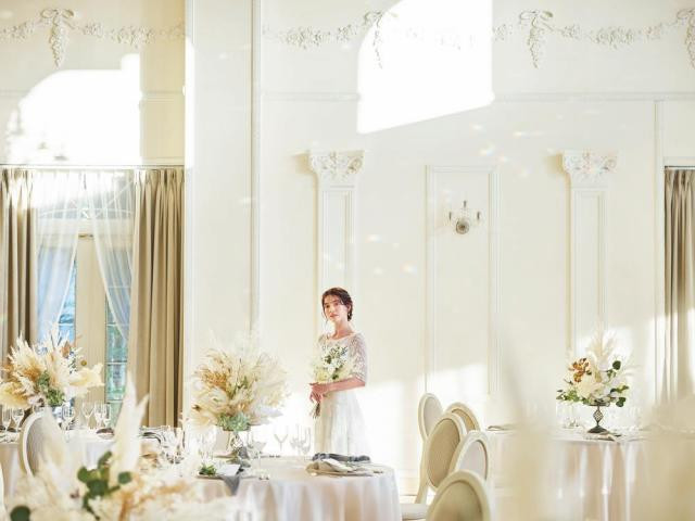 【初見学当日のご成約でご優待あり】白が基調で大きなシャンデリアが特徴的なプール付き披露宴会場、ガーデンテラスとの行き来が自由で2階まで吹き抜けの解放感あふれる披露宴会場。2つの会場をじっくり見学して♪