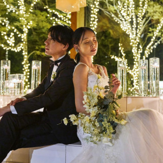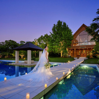 ガーデン演出 | 有り人気のガーデンもリニューアル!ガーデンカウンター登場で更にお庭での演出も楽しめる!広大なガーデンで、夜空を彩る花火や愛犬とのご入場も☆ |