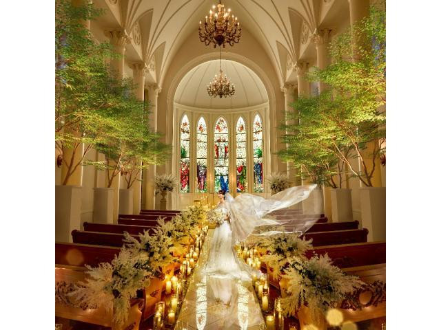 【光と緑が映えるチャペルリニューアル!】28Mの天井高は大阪エリア最大級。キャンドルの光と1800年代のヨーロッパから受け継いだステンドグラスが煌めく空間で挙式体験にご案内。