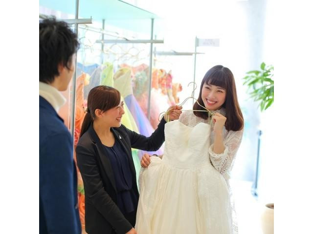 【ドレス試着ができる限定フェア】約500着ものドレスを取り揃えるドレスサロンで衣装試着。自分に似合うドレス選びのコツも教えてくれる♪青の大聖堂&貸切邸宅にて演出体験◆パティシエ特製スイーツ付き
