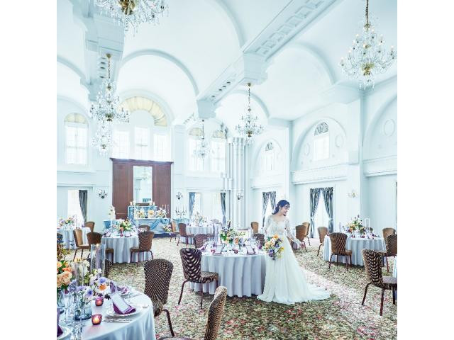 ステンドグラスが輝く大聖堂は、細部まで造り込まれ、ヨーロッパの本物のチャペルのよう。幸せの象徴であるブルーのバージンロードは花嫁をより一層美しく見せる。溜め息がもれるほど感動的な雰囲気を体験してみて