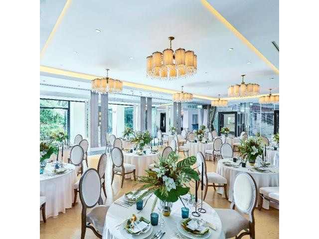 挙式前日まで日程変更を無料で承ります(ご成約後の人数・プラン変更も可能)。また、ダスキン社と当社がコレボレーションした空気清浄機を完備。大きな開口の窓もあり、大人数のゲストでも密にならない迎賓館です。