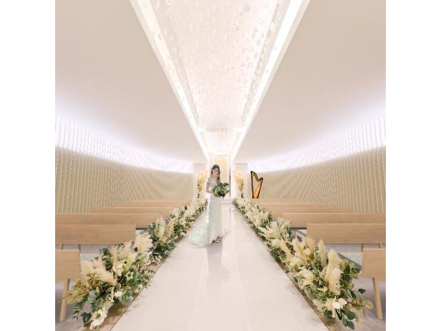 【2021年8月リニューアルOpen】20mを超える大理石のバージンロードと天井に敷き詰められた無数のスワロフスキーの煌きがふたりを祝福。最新のライティング演出にて、当日さながらの感動の挙式体感が可能