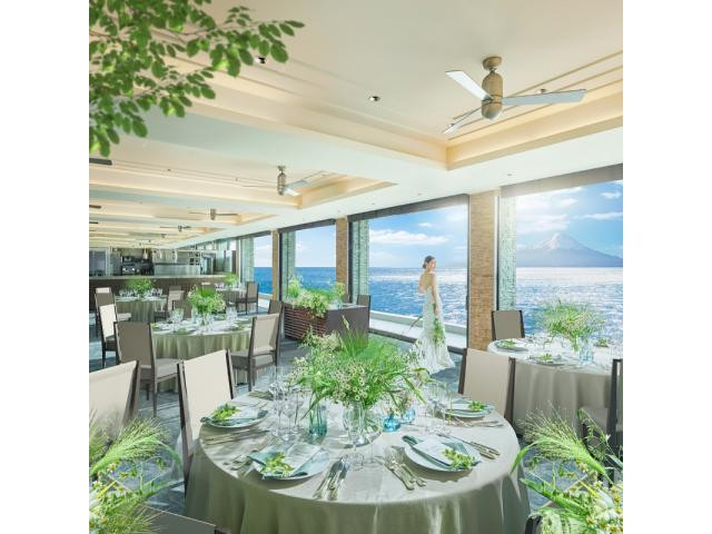 【リゾート×オープンキッチン併設会場】海×富士山の絶景を望む開放感!海まで2秒のロケーションだから叶う*砂浜からサプライズ入場はゲストも初体験の人気演出♪海の絶景と出来立てのお料理で上質なおもてなし