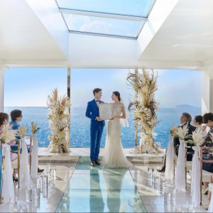 青い海と空をバックにテラスでのゲストとのフォトや演出も人気♪