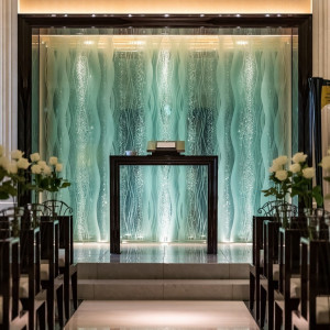 挙式会場は自然光が入り、とても明るくて良かったです。正面の壁には、新婦のウエディングドレスが映えるよう水色のスワロフスキーが施されておりとても綺麗でした。詳細を見る (389文字)