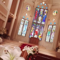 ステンドグラスのチャペルでした。模擬挙式を体験させて頂きました。とても可愛くて、聖歌隊の方が実際に歌って下さり、当日の挙式をイメージできました。シャボン玉や、ウィングシャワーなど、演出が素敵でした。階段があるので、後ろの方に座る人も見やすく、そこもいいなと思いました。