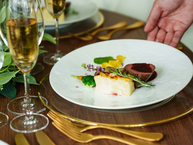元三ッ星シェフ監修の創作和フレンチはゲストにも好評!ご成約で料理重視のお客様にはご成約で1名/5,500円分の料理2ランクアップ特典付き!※人数・時期・時間帯・お日柄等により特典内容は異なります。