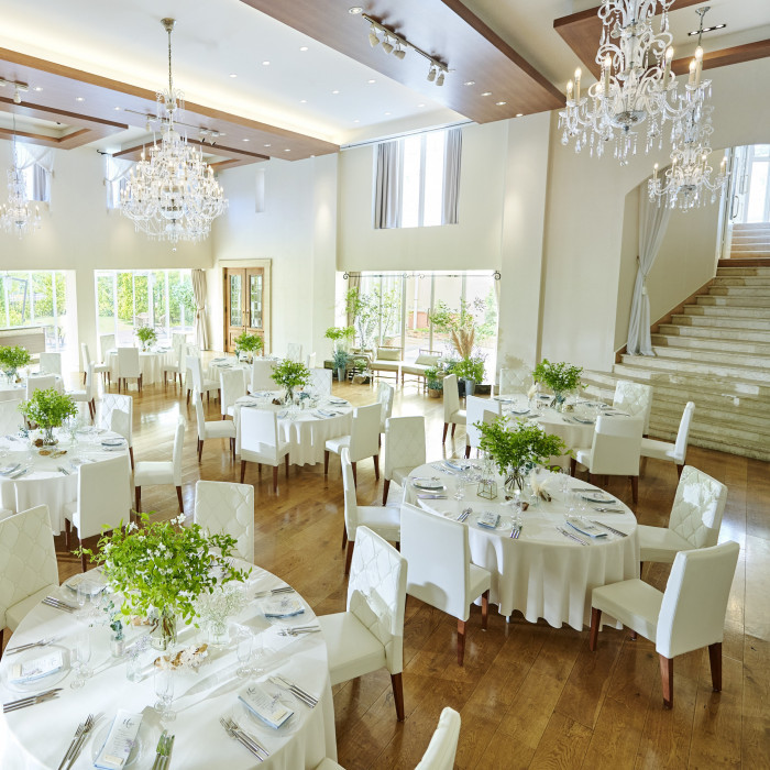 おすすめ ポイント | 天井が高く、シャンデリアが魅力のパーティ会場。たくさんの窓からはガーデンの様子も見え、開放感抜群!おふたりのお部屋のようにあたたかくゲストの方とゆっくり過ごしていただける仕掛けがたくさん!