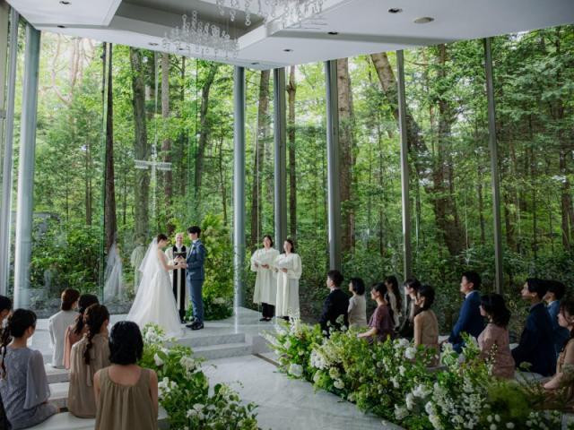 自然美溢れる軽井沢の森に佇む全面ガラス張りチャペル。