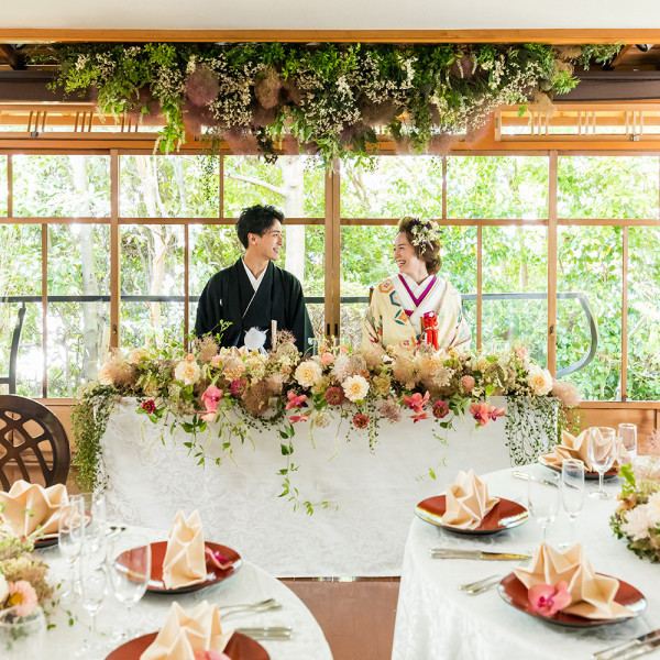 北野天満神社での神前式とハンター迎賓館での披露宴がセットになったプランです。和装で厳かな挙式、伝統美を感じる一日を。