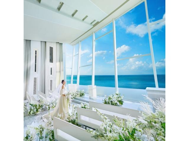 【海と空を一望!絶景チャペル】ドアが開かれた瞬間の感動を味わって!バージンロードを歩きながら本番さながらの挙式体験を♪◎ゲストとの距離が近いのも魅力◎《成約特典:挙式料20万円プレゼント》