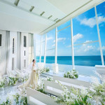 祭壇に立つふたりの目の前に青い海が広がるチャペル