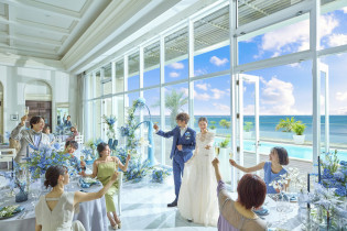 3つのチャペル全てがオーシャンビュー。海のように深く愛を誓う 祭壇の向こうに青い海が広がる開放的なチャペルです。入場した瞬間にカーテンを開き、海と砂浜、そしてどこまでも続く青い空が現れる・・・