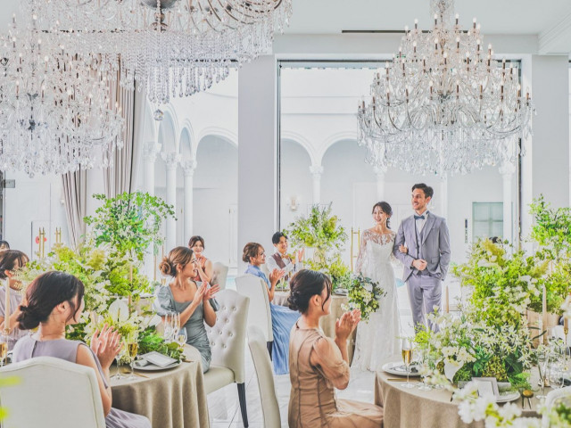 【フロア全体を自由自在コーディネート】フロア貸切で好きなコーディネートが可能!自然光がシャンデリアに反射する幻想的で明るい”ジュワルミエール”ラグジュアリーな大人かわいい”メインダイニング”から選べる