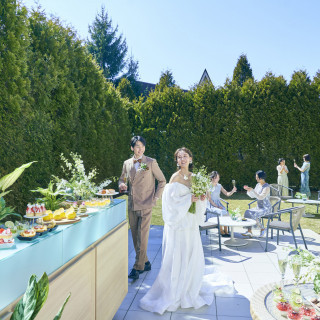 バーカウンター付きのガーデンで乾杯やデザートブッフェなど自然に囲まれたセレモニーを。