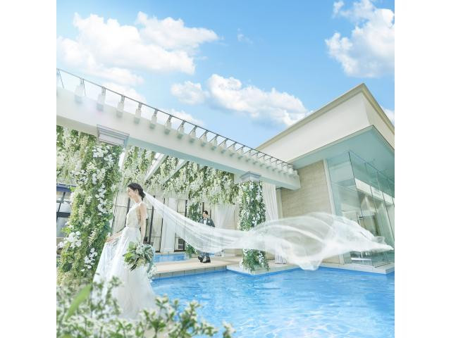【午前中フェアがお勧め!本番直前の装花コーディネートやスタッフなどリアル体験!】<天井高7m>プール付ガーデンへ繋がる、自然光差し込む開放空間。憧れの階段入場やガーデンでのカジュアルパーティなどご提案