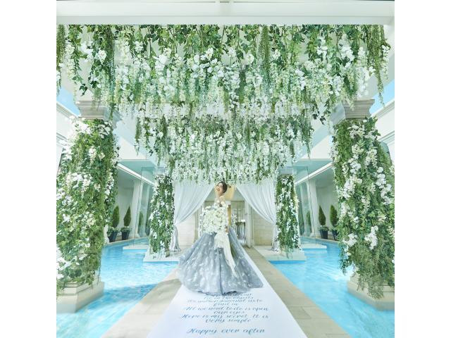 【午前中フェアがお勧め!本番直前の装花コーディネートやスタッフなどリアル体験!】<天井高7m>プール付ガーデンへ繋がる、自然光差し込む開放空間。憧れの階段入場やガーデンでのカジュアルパーティなどご提案