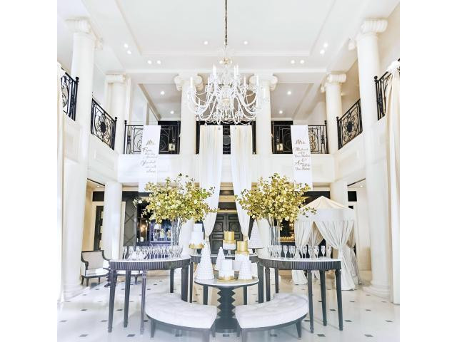 天井が高く、両階段が優美に映えるパーティ会場。白を基調としているので、どんなコーディネートも素敵にマッチします。プール付きのガーデンと隣接しているので、とても開放的な空間です。