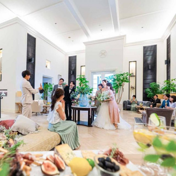 | おすすめ ポイント | パーティ会場は自然光がたっぷりと入る明るい空間。テーブルコーディネートや装花が映えるよう、白を基調としたインテリアで統一