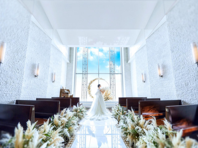 【地上60mの絶景チャペル♪感動体験】青空と自然光に包まれた天空チャペル。花嫁姿がより輝く幻想的な純白のバージンロード・祝福に包まれるフェザーシャワーなど特別演出をフェアで体験!【1件目来館で挙式料無料】