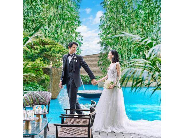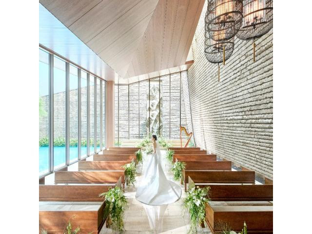 【水と光の独立型チャペル体験】ホテルでありながら開放感の溢れるチャペルにて挙式入場を体験いただけます。自然素材のチャペルは、自由度の高い挙式の形を楽しんでいただけます。挙式後はテラスで過ごす時間も。