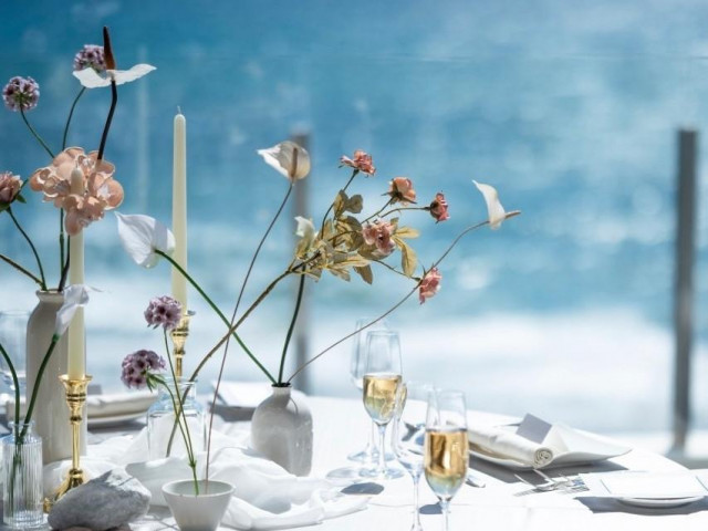 【お人数様に合わせて選べる会場】空と海の鮮やかな青をパノラマで望むことができるパーティ会場。絶好のロケーションを眺めながら味わう料理は格別です。160名収容の会場と少人数にぴったりなレストランも併設。