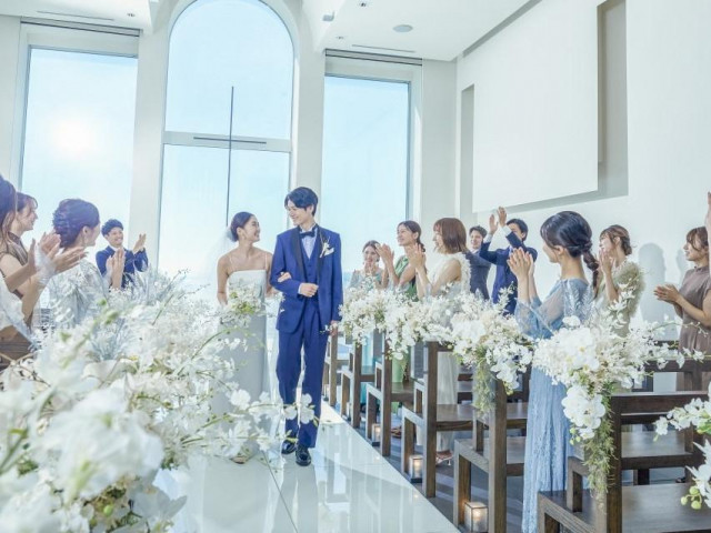 【海へと続くバージンロード】一面ガラス張りの祭壇からオーシャンビューを望むチャペルで感動演出体験を。最新のプロジェクションマッピングも導入!目の前に広がるここにしかない美しい空と海をご体感ください。