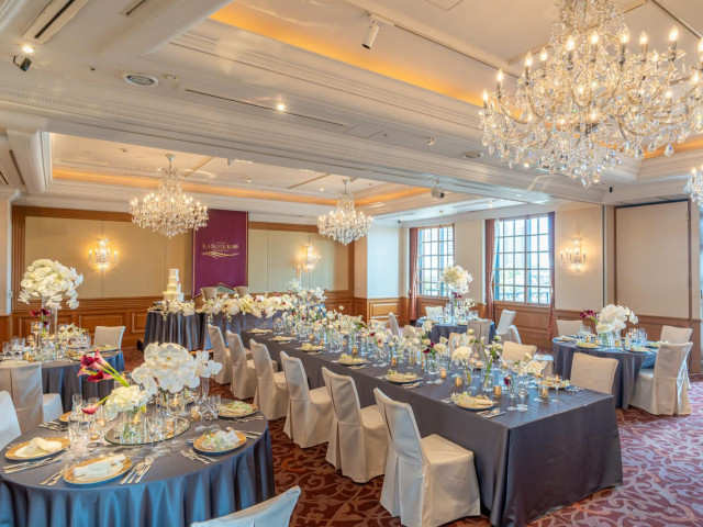 【専属コーディネーターによる空間演出】優雅に煌めくシャンデリアが、華やかで高級感を演出。会場コーディネートをご覧いただき、レイアウトやカラーコーディネートをおふたりらしくアレンジしていただけます。