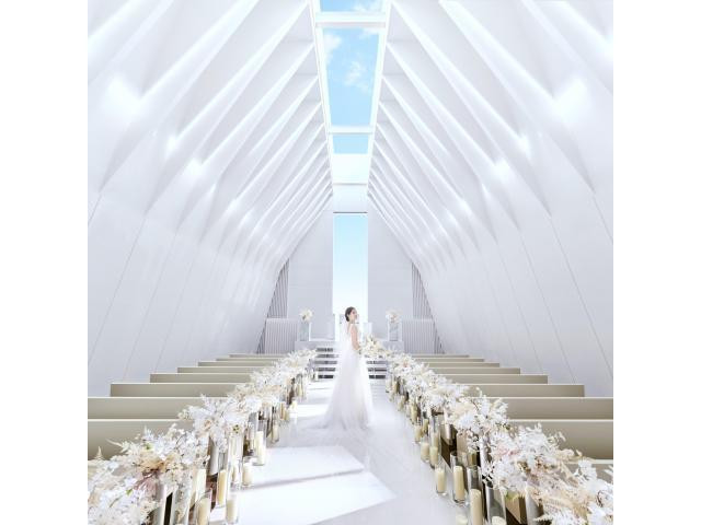 【自然光差し込む幻想的なチャペル】お越し頂く全てのゲストとの絆が深まる挙式。過去~未来へと続くヴァージンロード!ゲスト全員に見守ってもらえるシアター形式のチャペルが感動的なセレモニーを演出します!