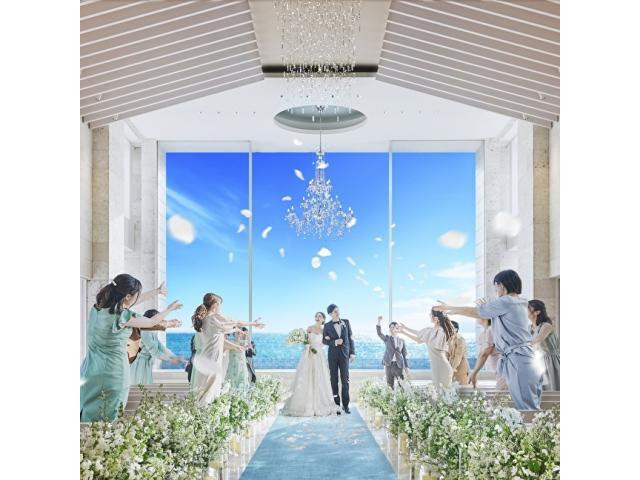【きらめく海と空を独占する感動のオーシャンビューチャペル】どこまでも広がる水平線、茜色に染まるサンセット…特別な瞬間がおふたりの誓いを彩ります。非日常空間で、ゲストの記憶に残る1日を。