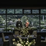 白を基調した挙式会場は、大きな窓から自然光が入り、洗練された空間に、天井のアートやシャンデリアが華やかさを添え、ガラスのバージンロードが透明感と特別感を演出していました。窓からは素晴らしい庭園が広がり、明るく清らかな雰囲気で、まさに夢のような空間でした。広々としていて、大きな窓があり、開放感を感じました。外の素晴らしい庭園が見え、外に出ることもでき、非日常感を味わうことができました。希望の場所から、無料でバスを手配できるとのことで、交通の便には困らないかと思います。会場のすぐとなりに大きな駐車場もあり、車で来られるゲストからも喜ばれると思います。入り口は屋根が付いているため、雨の日でも濡れずに会場まで入れます。庭園で写真を撮れる和装をしたいカップル詳細を見る (328文字)