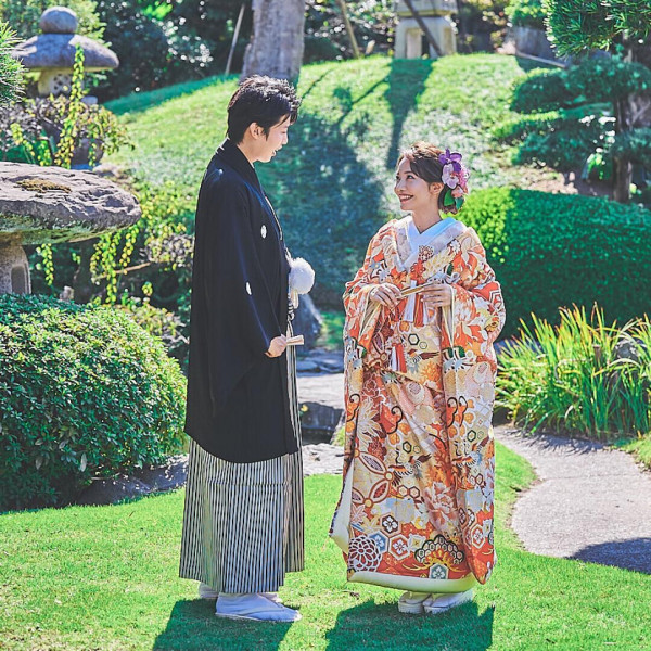 6000坪の美しい庭園に佇む神殿は鹿児島では珍しい独立型。家族と心を合わせて歩む「参進の儀」はここならでは。少しだけ和の要素を取り入れた「ナチュラル和」も人気。人力車入場や和装にピッタリの演出も多数用意!